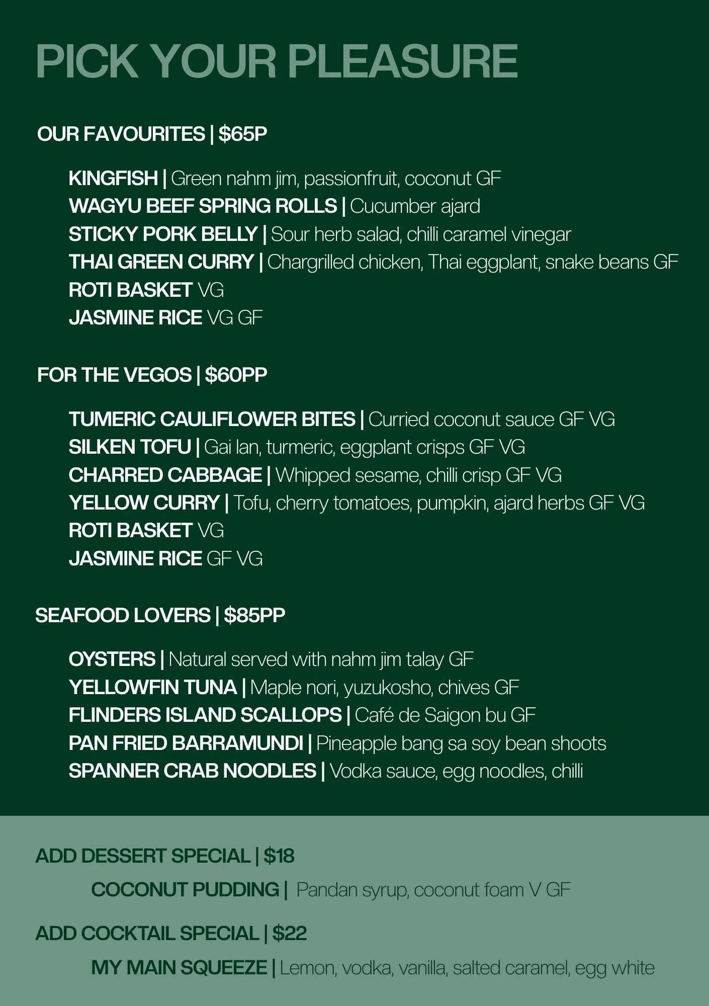 PICK YOUR PLEASURE FROM 3 INDULGENT BANQUETS, ADD A COCKTAIL TO SET THE MOOD, THEN FINISH WITH A DESSERT WORTH LINGERING OVER.